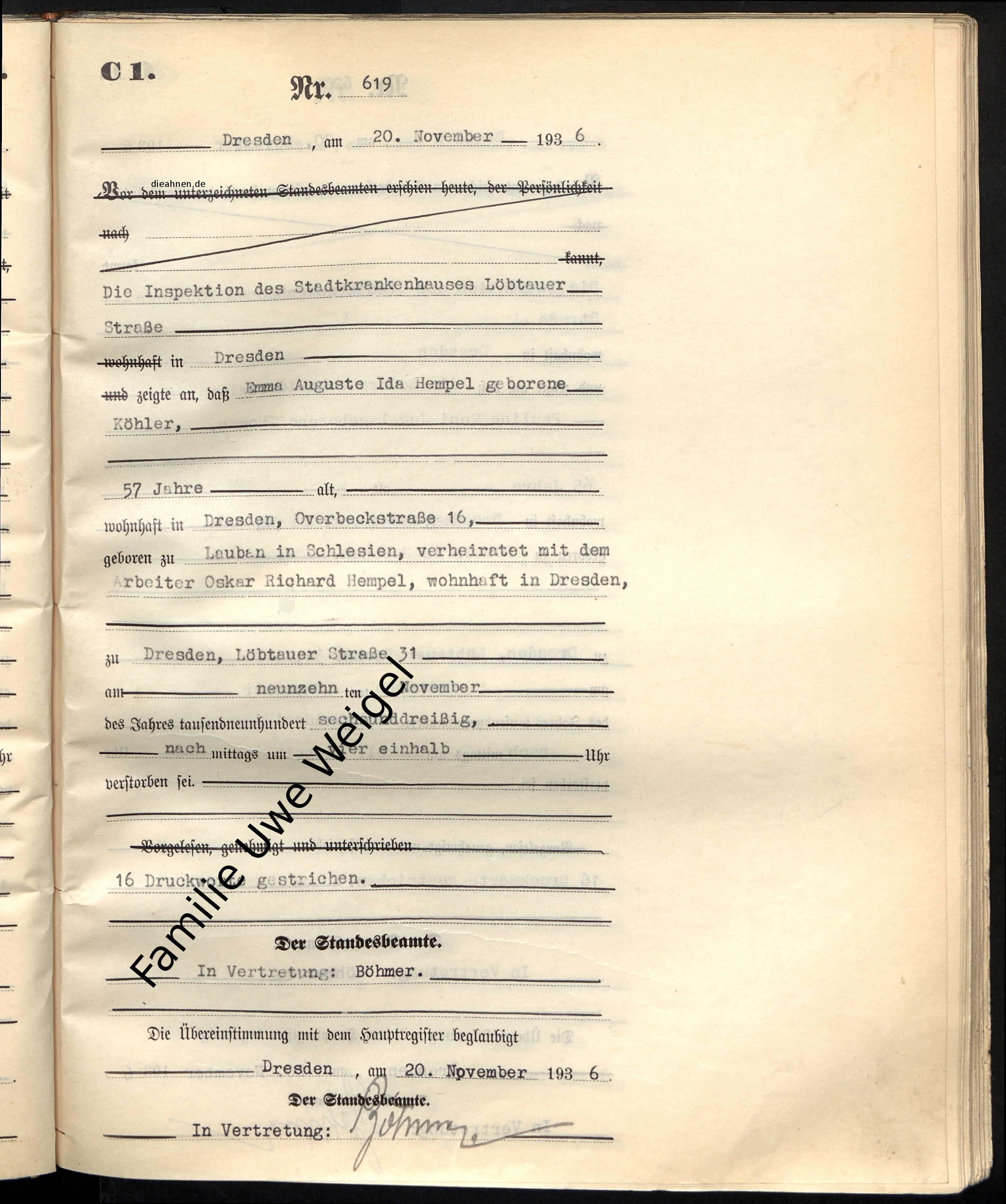 | Tod einer Mutter | Emma Auguste Ida Köhler 19. November 1936 – 16:30 (Alter 29 Jahre) |