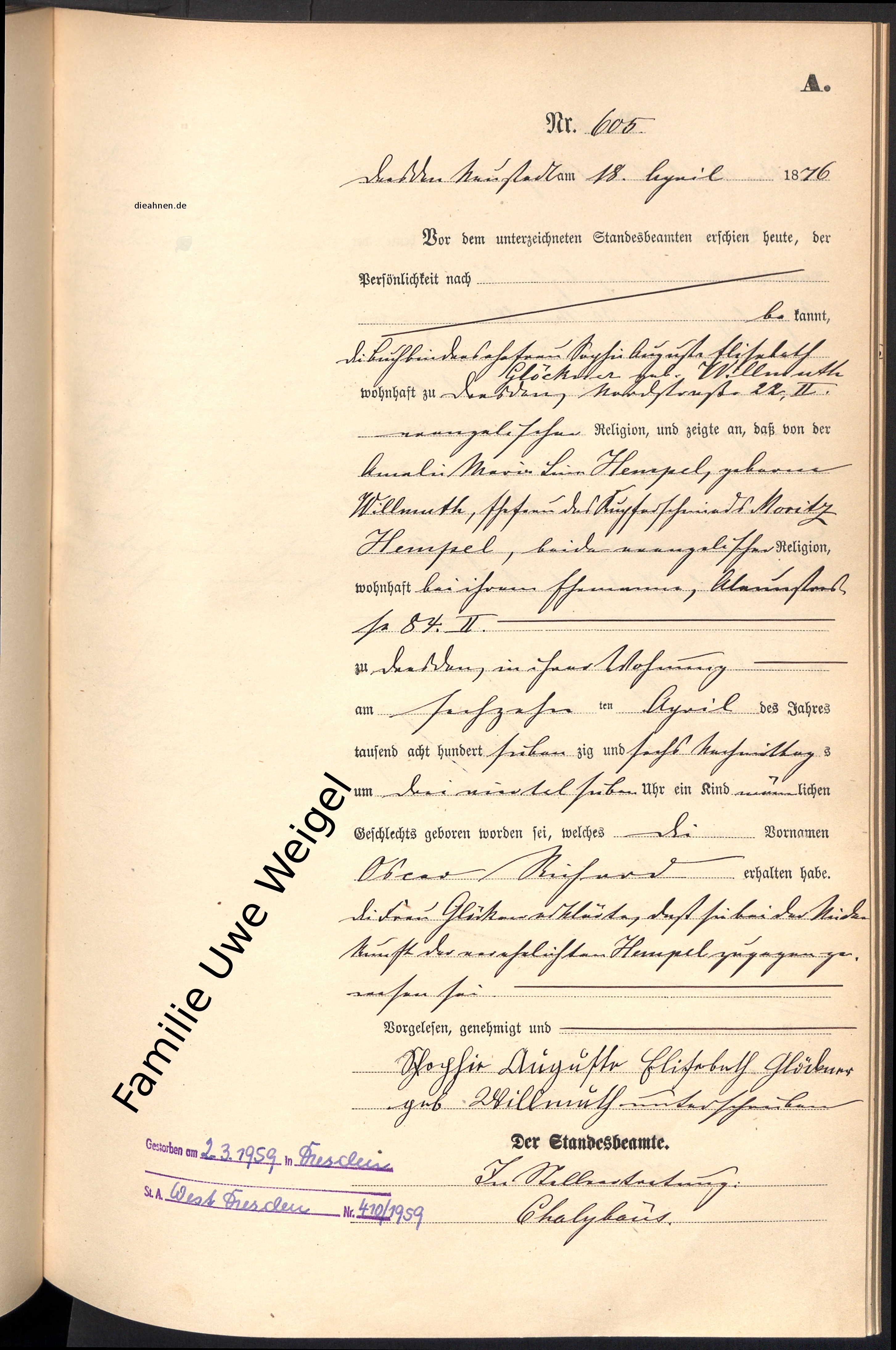 | Geburt eines Sohns #1 | Oskar Richard Hempel 16. April 1876 (Alter 22 Jahre) |